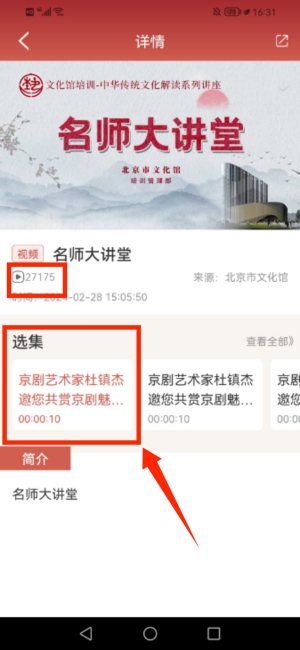 3、在学才艺页面选择名师大讲堂内容,点击选集查看视频。