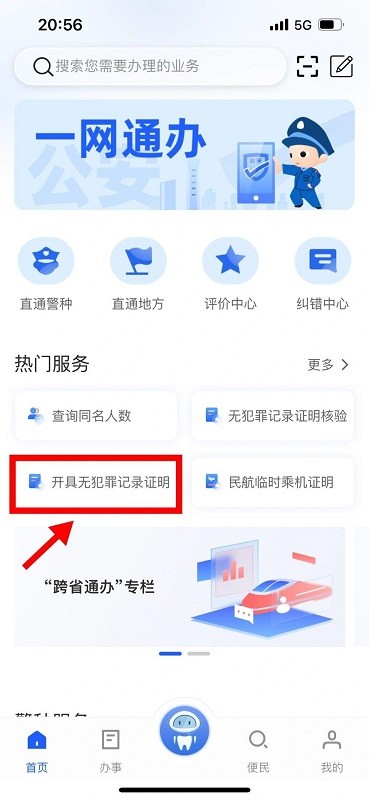 1、进入app,首页中间的热门服务即提供“开具无犯罪记录证明”;