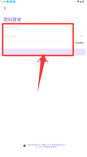 2、在登录页使用密码登录,填写手机号与密码确认。