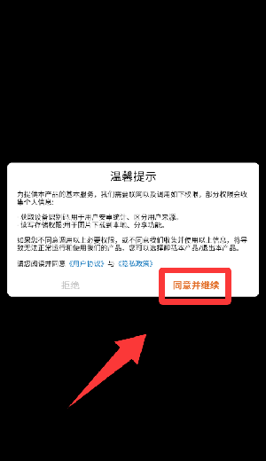 1、点击温馨提示里的同意并继续。