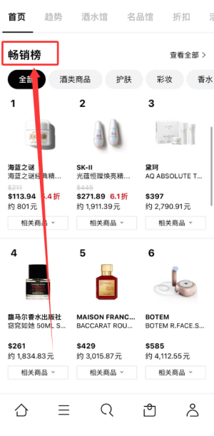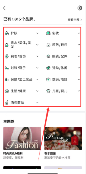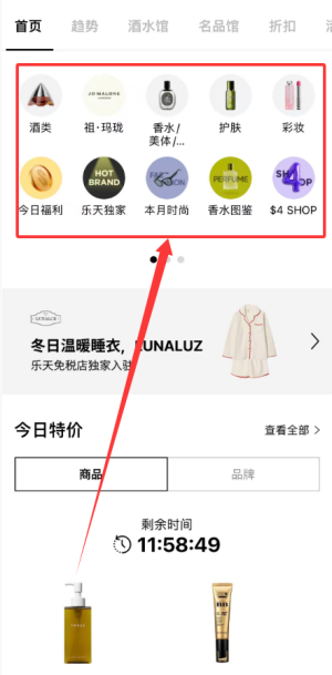 2、首页汇集了酒品、香水、护肤、彩妆、本日特惠、专属品牌及时尚资讯等板块。