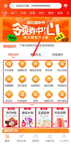 2、在主界面选择网购返利、抖音返利等分类,可查看免单等专属福利入口。