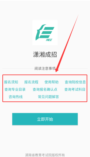 3、主页提供报名社区、流程指引、使用帮助、专业目录查询、咨询热线及问题解答。