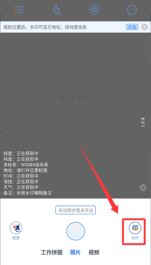 1、执行拍照与打卡,在工作现场打开应用,使用水印相机拍照,该动作可同时作为一次定位考勤记录。