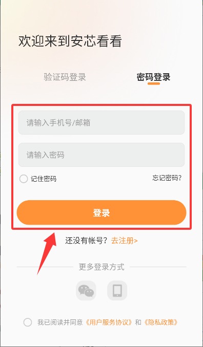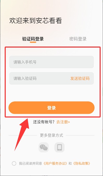 3、已有账号者可选验证码登录,点击后输入手机号获取并填写短信验证码。