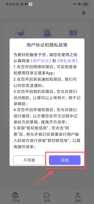 1、打开应用后在用户协议提示框内点击红色同意按钮,进入程序。