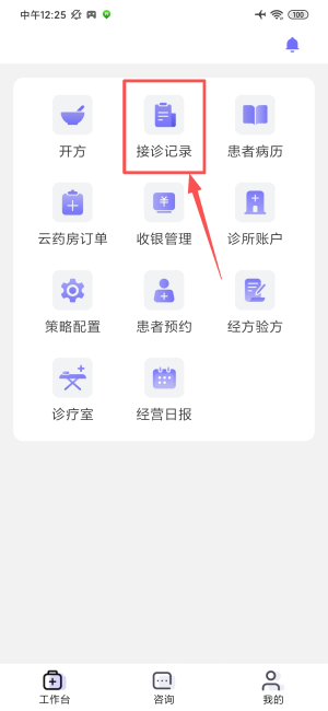 3、登录后进入工作台界面找到红色接诊记录选项,点击查看相关信息。