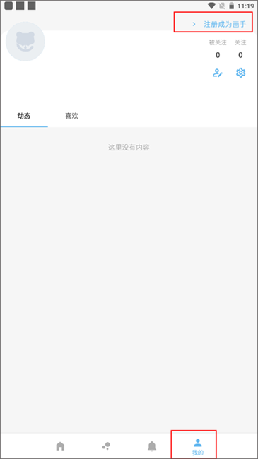 (1)选择下方菜单栏【我的】板块界面,这时你可以在右上角看到“注册成为画手”这几个文字,点击它。