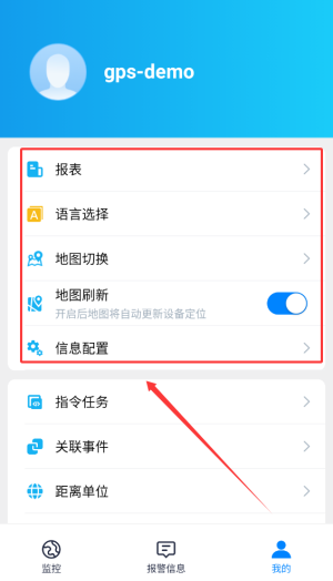 4、我的页面支持数据报表查询、界面语言切换、地图样式调整、地图刷新及信息参数配置。