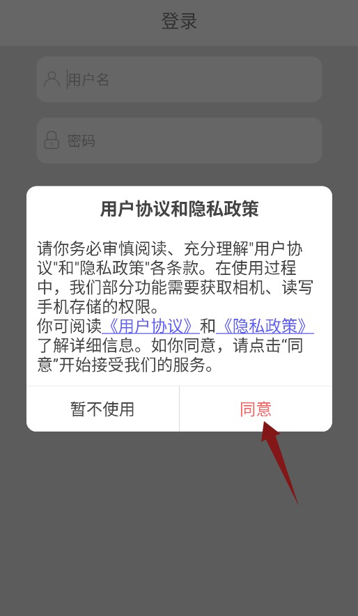1、首次启动应用需点击确认协议弹窗,同意后方可进入登录界面。
