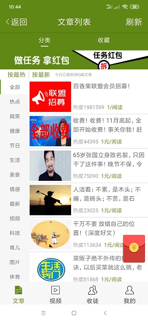2、手机软件上出示了游戏娱乐、新闻报道、特色美食、搞笑幽默等文章视频,內容靠谱翠绿色,转发发送到微信被阅读文章就会有现钱收益