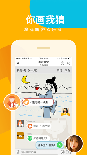 【经典桌游 找个玩友一起嗨】「狼人游戏」线下组局人不够?来“会玩”语音房,千万玩友在线联机,全程烧脑,期待一场真相与谎言的逻辑推理大作战!「你画我猜」随手涂鸦,互动解谜,你永远不知道会遇 见什么样的灵魂画手 ;「谁是卧底」《快乐大本营》最爱玩的明星互动游戏,线上也能玩啦,快来和卧底伙伴们大战300回合吧!