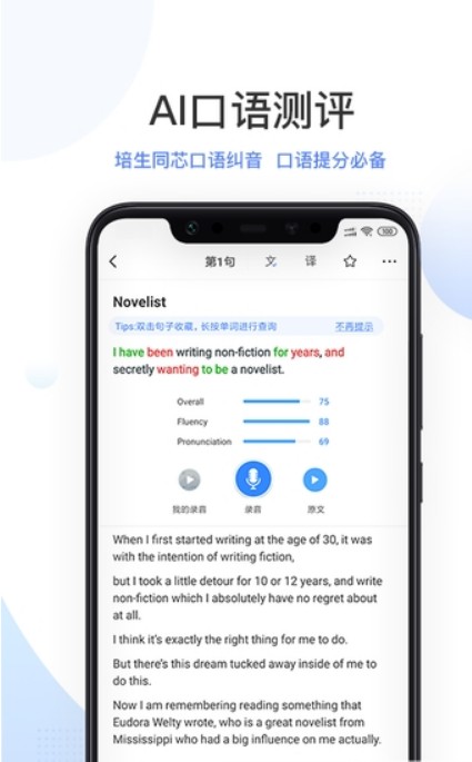 4、RA/RS/RL/DI/ASQ/单词,口语练习测评功能,为英语口语考生揭露音标、单词、句子、段落的弱点所在,提供考试总分、流利分和发音总分让考生参考来对自己的发音进行修正