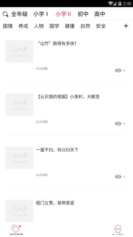 人民日报少年客户端是一款免费的教育类手机新闻软件。面向中小学生用户提供了丰富的新闻资讯和电子阅读资源,可以在线浏览最新的新闻内容,关注国内重大新闻事件。