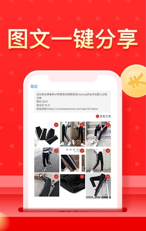 【社交传播】支持商品链接、图文一键分享,动动手指即可促成收益。