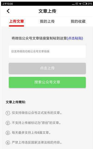 1、软件特点:转发文章赚钱,新用户登陆即送1元,活动期间文章单价为0.6元,活动之后0.3元,支持自己上传文章。