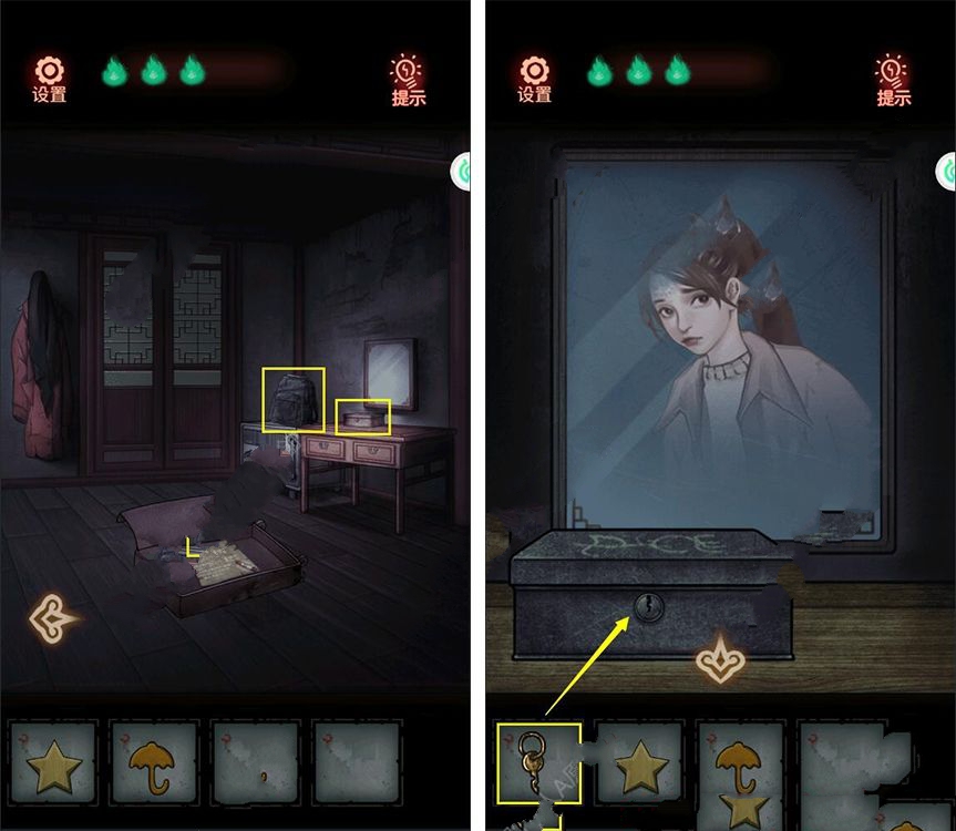 26.拾取背包上的【钥匙】,用【钥匙】打开梳妆台上的盒子,获得【心碎饰品】。