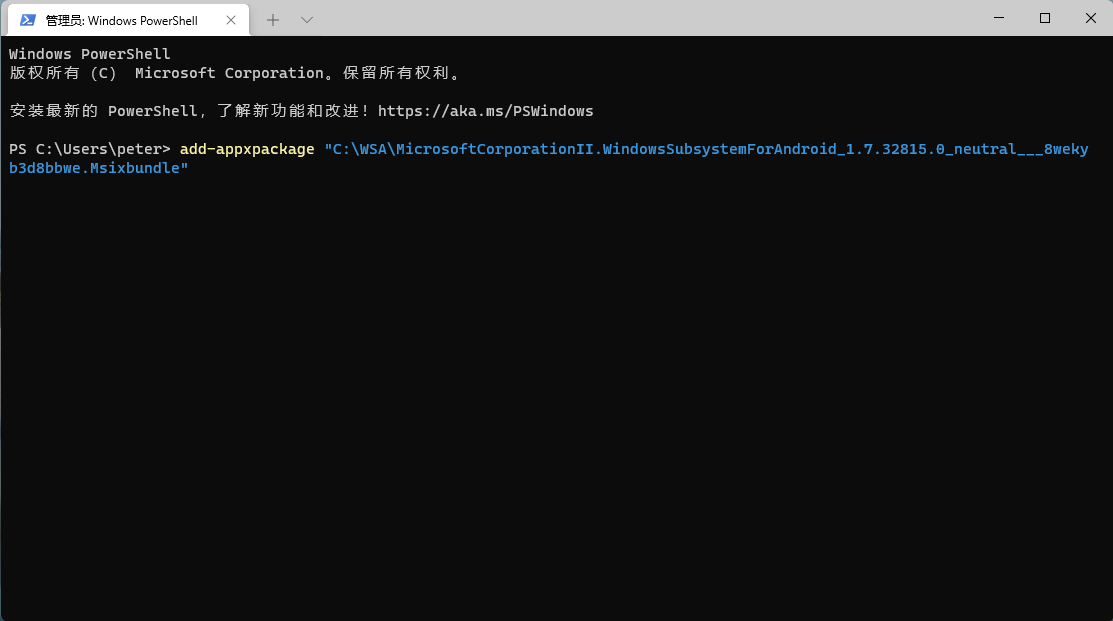 add-appxpackage "xxx" #引号内改为文件所在位置及文件名