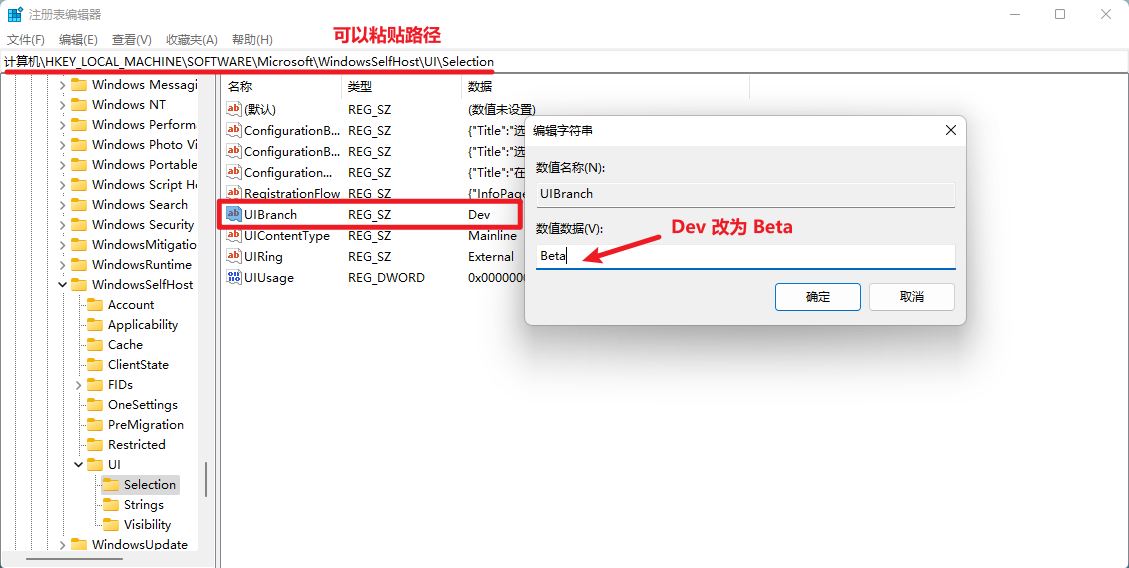 HKEY_LOCAL_MACHINE\SOFTWARE\Microsoft\WindowsSelfHost\UI\Selection