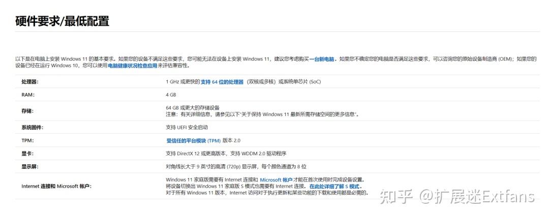 需要1GHz或更快的支持64位的处理器(双核或多核)或系统单芯片 (SoC);4GB内存;64GB或更大的存储设备;支持UEFI安全启动;受信任的平台模块 (TPM) 版本 2.0;支持DirectX 12或更高版本,支持WDDM 2.0驱动程序;对角线长大于9英寸的高清 (720p) 显示屏,每个颜色通道为8位。