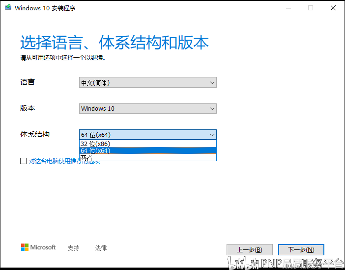 4、选择需要安装操作系统的版本,这里建议大家更改体系结构为32位、64位都兼容的“两者”。