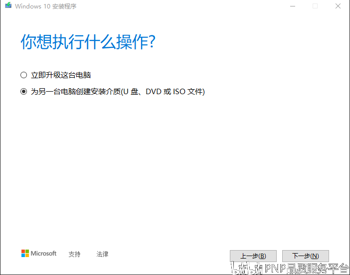 3、打开运行windows10安装程序后会提示你执行什么操作,选择为另一台电脑创建安装介质选项,然后点击下一步。