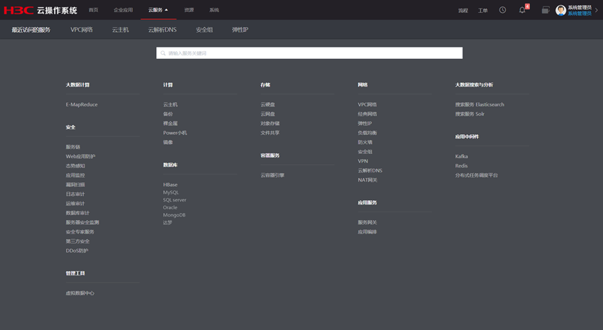 自助式服务门户是H3C CloudOS5.0云与智能平台供租户申请、使用、管理云服务的门户,通过自助服务门户,用户能够申请IaaS服务资源、应用服务、大数据服务、AI服务、开发测试服务等。