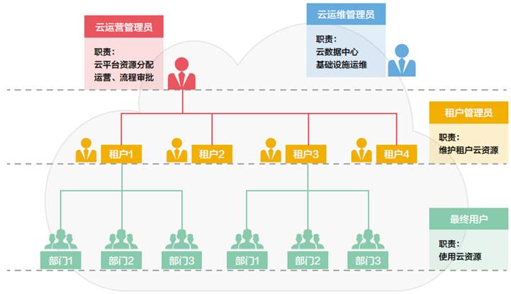 云管理员负责云数据中心的运维与运营,一方面云管理员需要负责云数据中心基础设施的运维工作,另一方面要负担起租户管理、流程管理、计费管理等运营工作。在大型的云数据中心中,云运维管理员和云运营管理员将会有不同人员负责。