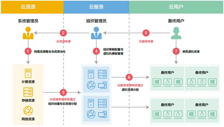 对于政务、企业、教育等用户中,云资源的使用往往需要进行审批,H3C CloudOS5.0云与智能平台提供完备云服务申请周期管理。租户在使用云资源时,需要就云资源提出申请,当审批人审批后,云资源会自动的部署并推送到用户自助服务门户。