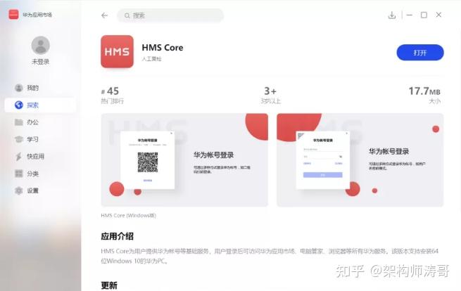 ④下载并安装华为 APP Gallery。初次启动华为应用市场,默认会进行版本更新。更新完成后,在市场中搜索并安装 HMS Core。