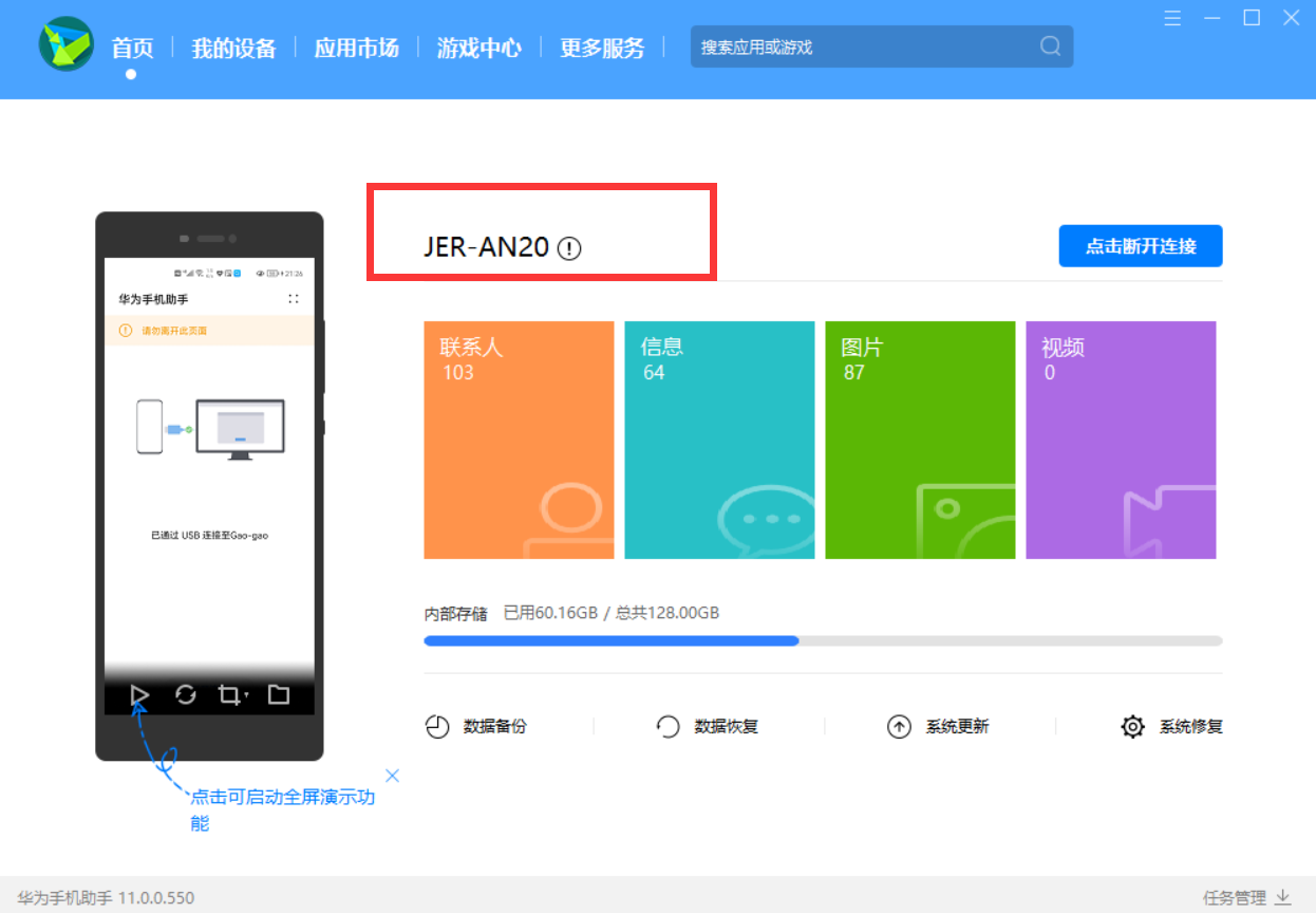 连接成功后,我们点击“华为手机助手”窗口中的“系统更新”,就会弹出“系统更新”窗口。