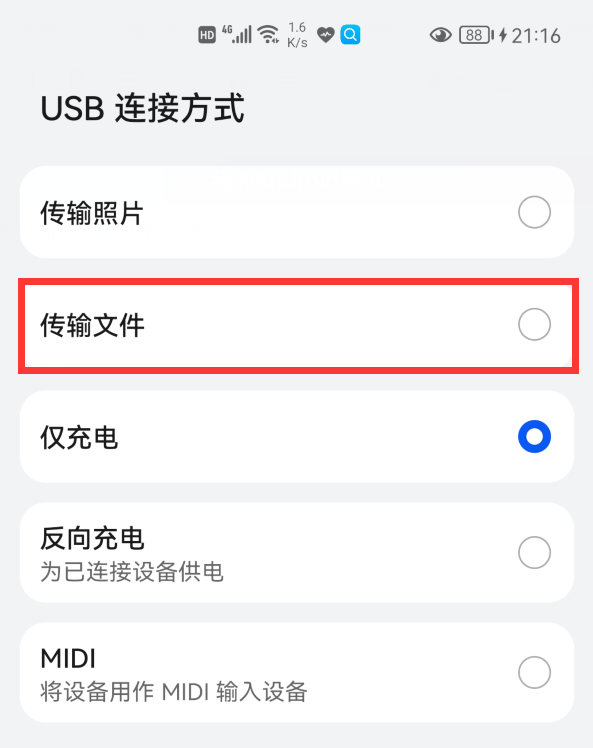 选择“传输文件“,这时会在手机屏幕上弹出“是否允许通过HDB连接设备”的弹窗,如果没有弹出这个弹窗,可在打开手机的“设置”,搜索“HDB”,然后开启它就可以了。
