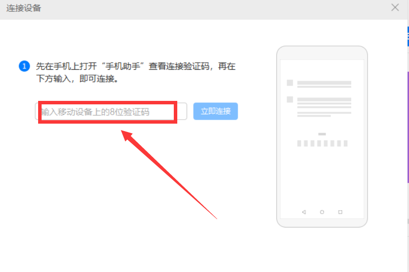 点击上图的“确定”,然后手机和电脑会自动处理一番,手机上会显示8位数的“验证码”,我们把这个8位数的验证码填写到电脑端弹出的窗口(如下图),就可以把手机和电脑连接起来。