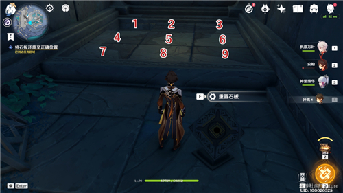 将8个石板还原成和密室看到的天花板图案一样即可,在初始状态下,依次移动4、7、8、9、6、5号位置的石板。