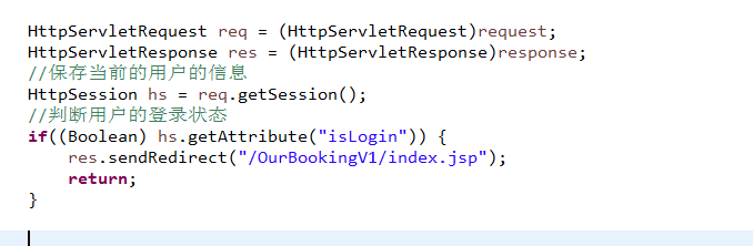 HttpServletRequest req = (HttpServletRequest)request; HttpServletResponse res = (HttpServletResponse)response; //保存当前的用户的信息 HttpSession hs = req.getSession(); //判断用户的登录状态 if((Boolean) hs.getAttribute("isLogin")) { res.sendRedirect("/OurBookingV1/index.jsp"); return; }