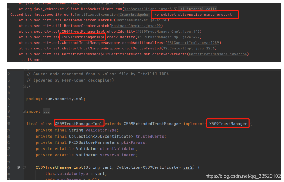 而包装器中除了执行原本的trust方法,还会进行加强处理,除了自身判断参数等外, 还会调用实现类X509TrustManagerImpl的静态方法校验证书的ip,dns等,当ip与证书不匹配时就会报出上述异常。
