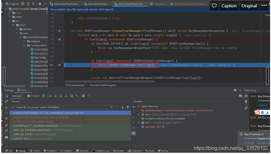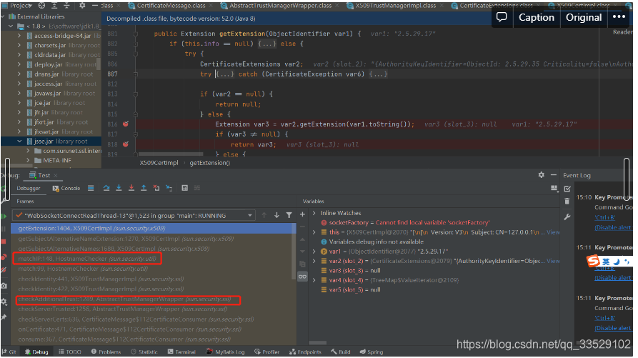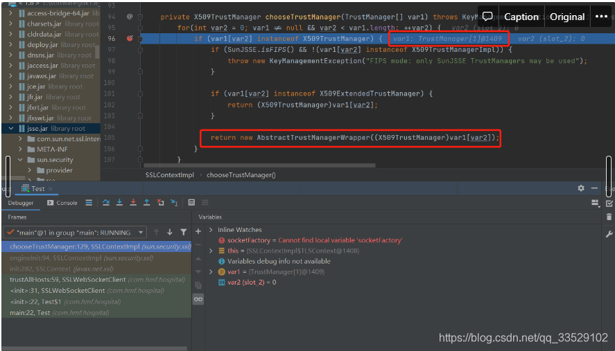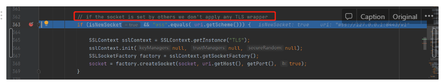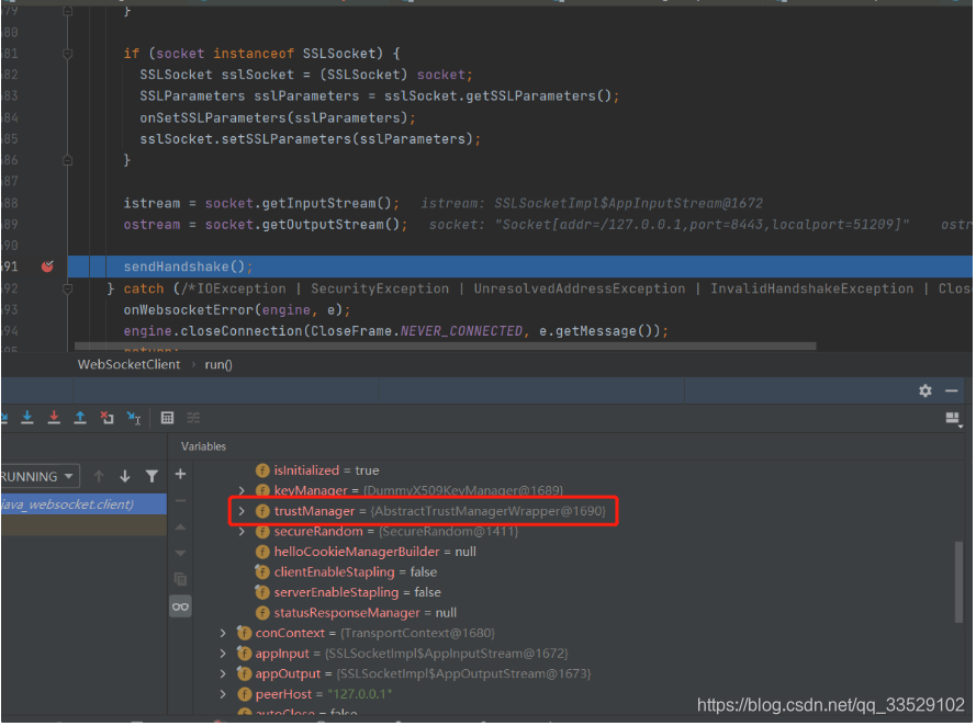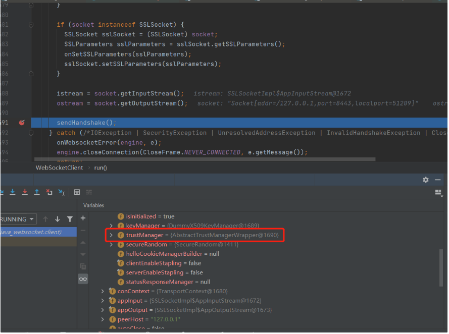 2、同时,打断点发现,在执行sslWebSocketClient.connect();时,socket中的trustmanager就已经是系统默认的抽象类了。
