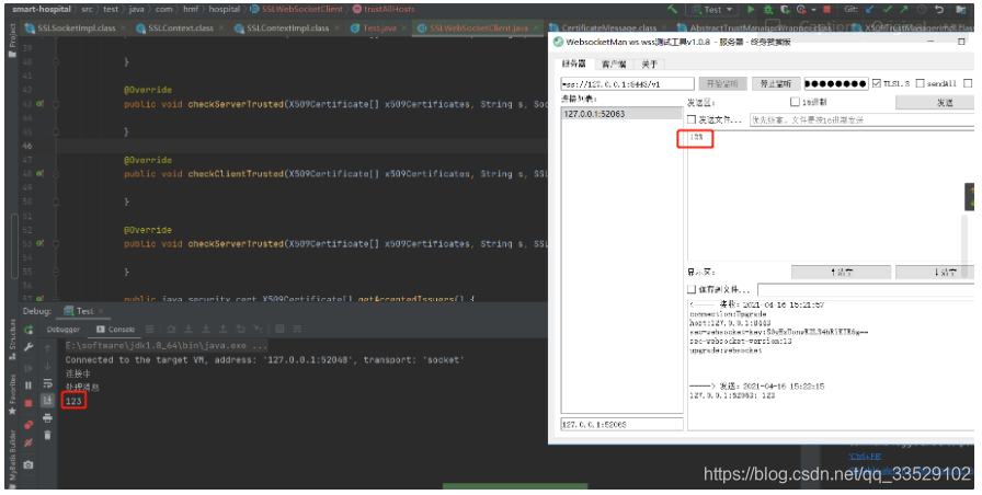 import org.java_websocket.client.WebSocketClient; import org.java_websocket.drafts.Draft; import javax.net.ssl.*; import java.net.Socket; import java.net.URI; import java.security.cert.CertificateException; import java.security.cert.X509Certificate; /** *构建SSLWebSocket客户端,忽略证书 */ public abstract class SSLWebSocketClient extends WebSocketClient { //构造方法 public SSLWebSocketClient(URI serverURI,String message) { super(serverURI); if(serverURI.toString().contains("wss://")){ trustAllHosts(this); this.send(message); } } public SSLWebSocketClient(URI serverURI,Draft draft) { super(serverURI,draft); if(serverURI.toString().contains("wss://")) trustAllHosts(this); } /** *忽略证书 *@paramclient */ void trustAllHosts(SSLWebSocketClient client) { TrustManager[] trustAllCerts = new TrustManager[]{new X509ExtendedTrustManager() { @Override public void checkClientTrusted(X509Certificate[] x509Certificates, String s, Socket socket) throws CertificateException { } @Override public void checkServerTrusted(X509Certificate[] x509Certificates, String s, Socket socket) throws CertificateException { } @Override public void checkClientTrusted(X509Certificate[] x509Certificates, String s, SSLEngine sslEngine) throws CertificateException { } @Override public void checkServerTrusted(X509Certificate[] x509Certificates, String s, SSLEngine sslEngine) throws CertificateException { } public java.security.cert.X509Certificate[] getAcceptedIssuers() { // return new java.security.cert.X509Certificate[]{}; // System.out.println("getAcceptedIssuers"); return null; } @Override public void checkClientTrusted(X509Certificate[] arg0, String arg1) throws CertificateException { System.out.println("checkClientTrusted"); } @Override public void checkServerTrusted(X509Certificate[] arg0, String arg1) throws CertificateException { System.out.println("checkServerTrusted"); } }}; try { SSLContext ssl = SSLContext.getInstance("SSL"); ssl.init(null, trustAllCerts, new java.security.SecureRandom()); SSLSocketFactory socketFactory = ssl.getSocketFactory(); this.setSocketFactory(socketFactory); } catch (Exception e) { e.printStackTrace(); } } }验证: