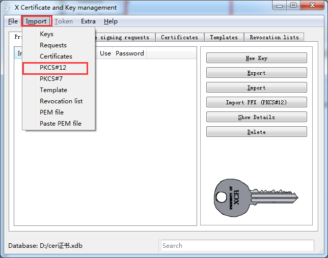 如果对方只给到你 .p12后缀的证书, 没有给到你 .cer后缀的格式的证书,那么你就要使用 .p12后缀的生成 .cer后缀的证书,在这里,我以 xca工具为例