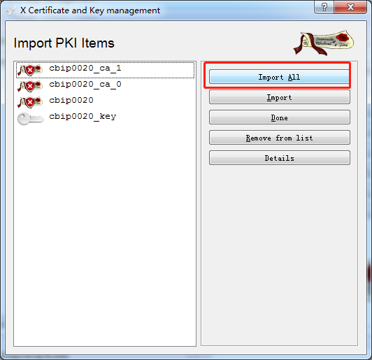 3、点击 import,选择PKCS#12,找到对方提供的 .p12格式的证书文件,需要输入证书的密码,然后点击import all