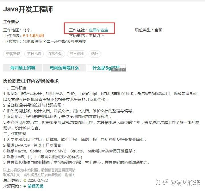 以上不要求有商业项目经验,当然如果有,绝对是加分项,而且这还是大公司的面试应届生的标准。至于一些小公司,或者是一些外包公司,有时候能招到人就阿弥陀佛了(至于有些能力比较强的一本的应届生愿不愿意去还难说)。有些在招收应届生的时候,不少小公司甚至在“项目经验”方面没要求,哪怕没学习项目经验也不要紧,只会问些网上比较大路的面试题,能说上来即可。