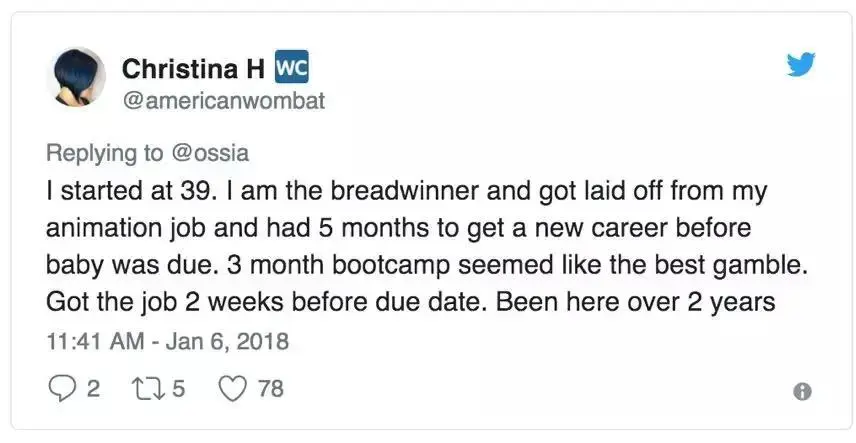 “我39岁开始的转行。我是要养家糊口的,却被从之前的动画相关工作上辞退,当时只有五个月我的孩子就要出生了。参加3个月的编程培训营似乎是我最有赢面的赌局,果然孩子出生前两周我找到了工作!现在已经两年多了。”