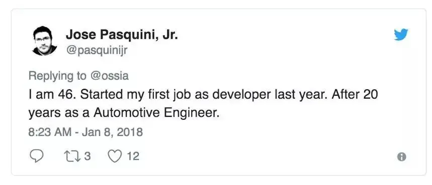 “我今年46,在作为自动化工程师20年后,去年开始了我的第一份开发工作!”
