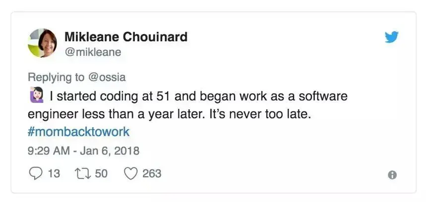 “我51岁开始编程,不到一年后成为了软件工程师。当你想做一件事的时候永远都不会太晚!”