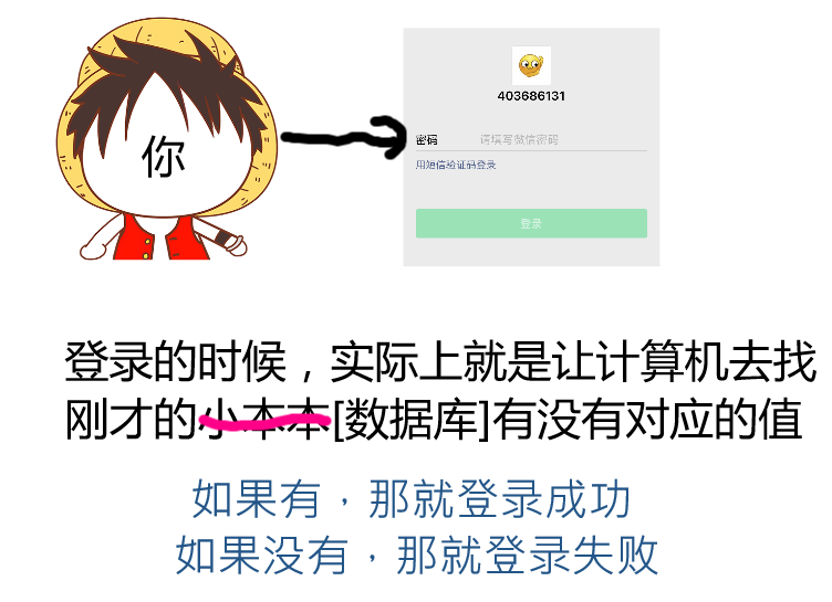 “如果你注册成功了,那~~小本本~~「数据库」就有你的账号和密码了。等你登录的时候,就去~~小本本~~「数据库」查一下你输入的账号和密码是否匹配”