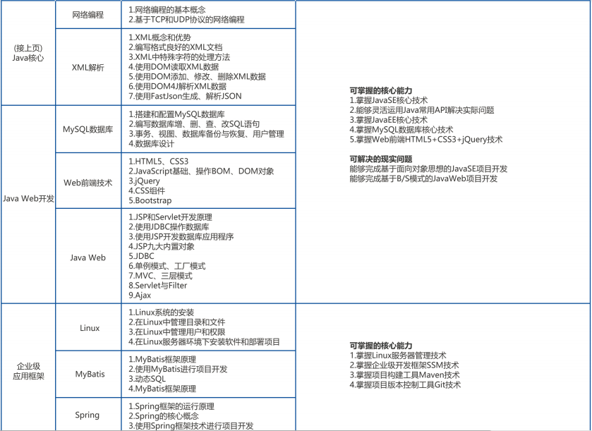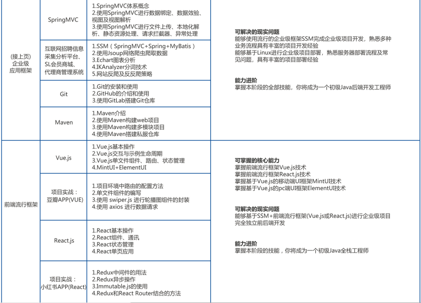 以上三点,是场长大大的些许肺腑之言,希望能对迷茫中的你有帮助。当然这里也可以给你一个系统的学习计划,这个属于课工场内部的学生学习的课程安排,这里有与你一样想做JAVA开发小伙伴,他们有大学毕业过来做项目系统学习的,也有工作几年后想转行的。你可以根据这个计划一步一步去执行,有计划的去攻克技术难点一定比像无头苍蝇一样四处找资料要靠谱和有效率得多吧。