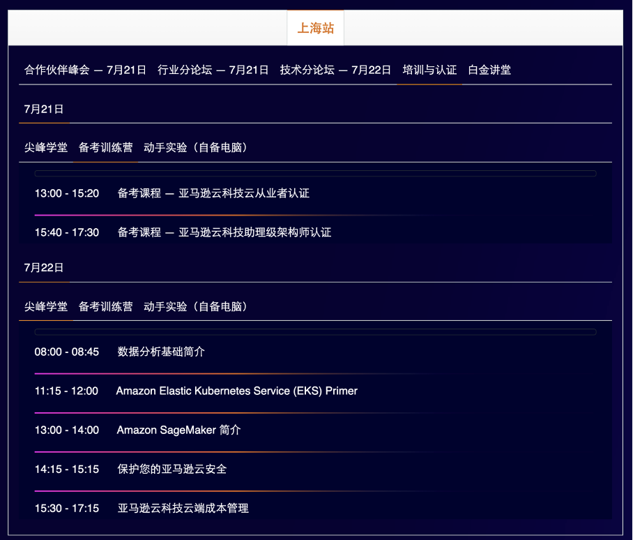 如果你对于啃下这10个半小时的英文课程是在没有什么信心,或者你想要获得2021最新的SAA和SAP认证资料,那么可以关注一下今年的亚马逊云科技中国峰会,这里有培训和认证的日程安排。