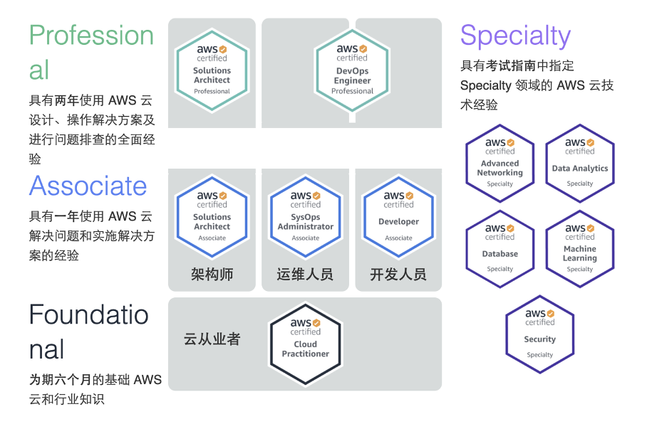 根据对亚马逊云科技服务不同广度和深度的理解,认证共有三个层级,分别是:基础级(Foundational)、助理级(Associate)和专家级(Professional)。