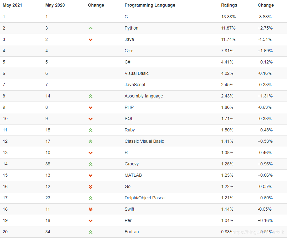 上图来自TIOBE2021年5月编程语言排行榜