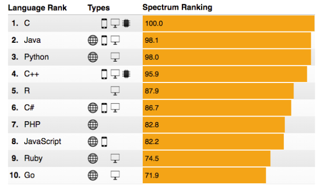 一些专业权威的机构也推出了他们的编程语言年度排行榜,例如TIOBE Index,又或者是下面这个来自IEEE的榜单: